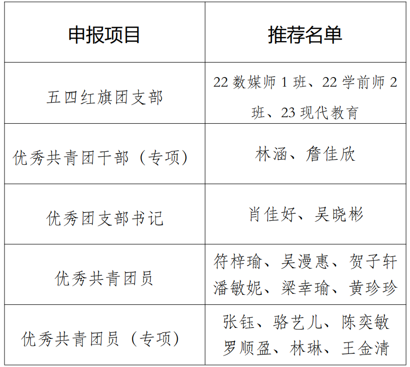 根据校团委《关于开展公司2024-2025年度五四评优表彰工作的通知》要求,经个人自荐和团支部推荐,院团委评定后,拟推荐22学前教育(师范)2班等3个团组织及个人参评公司2024-2025年度五四评优,以上集体和个人均符合参评要求,推选具体名单公示如下(见附件)”。
