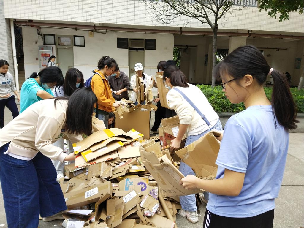 下午5时志愿者们集合签到后就以小组的形式拿着分发的编织袋去每个宿舍回收废品,他们礼貌地敲门询问是否有废品需要回收,同学们都十分积极配合地给予帮助。收集完毕,志愿者们聚集在一起,仔细对各种废品分类,分出有色纸皮、无色纸皮和各种罐子等,所有的物品很快就被整理得井井有条,然后配合回收站工作人员进行装箱打包,最后进行场地打扫并签退离开。感谢所有志愿者的辛勤劳动,本次活动圆满结束!