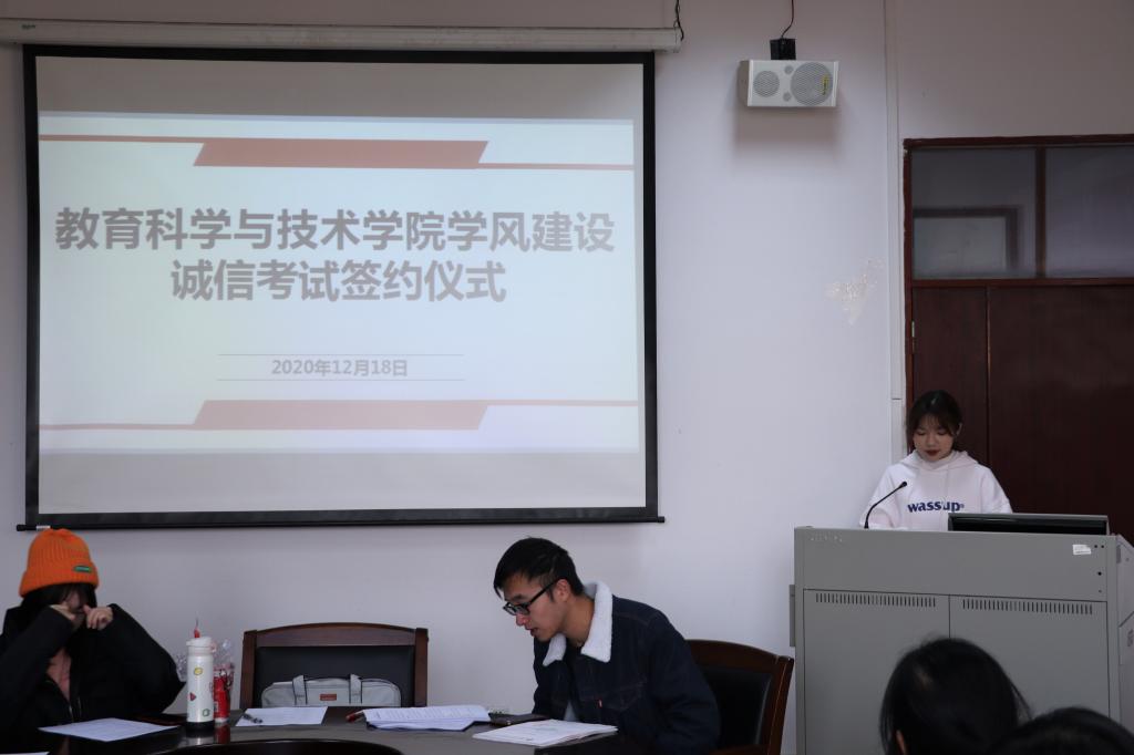 为加强公司学风建设,创造公平竞争的考试环境,在校园内形成以诚信为荣、以失信为耻的良好氛围,教育科学与技术公司于2020年12月18日下午16:45在白云校区第一教学楼315教室举行了教育科学与技术公司学风建设诚信考试签约仪式,参加本次会议的有公司团委、员工会主席团成员和各班学习委员。会议由主席团成员张静桦师姐主持。