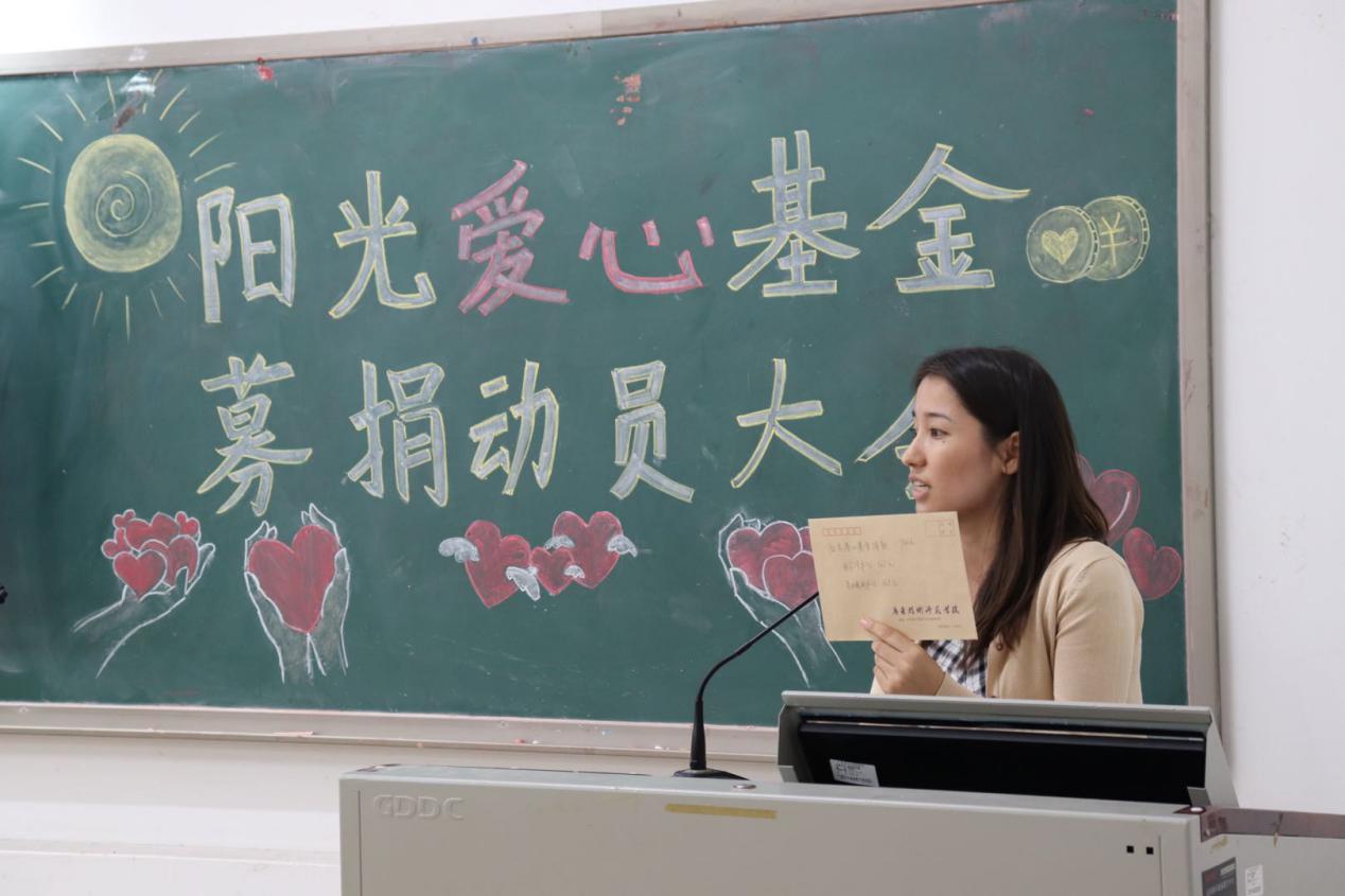 接下来主持人为大家介绍了“一毛钱”爱心计划。“一毛钱”计划即遵循个人意愿,鼓励同学们每天节约一毛钱捐献给阳光爱心基金会去以帮助有困难的同学。接着,辅导员热依拉老师和团委副书记刘晓潼师姐依次发表讲话,鼓励大家献出爱心,帮助有需要的同学。