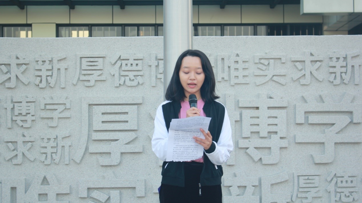 2020级新生代表李怡楠同学以“奋勇拼搏,与国共进”为主题在国旗下发言。她分享了对本次升旗仪式的感想,并表达了对进入太阳成tyc122cc集团开启大学学习生活的美好憧憬。她表示,作为新时代的青年,我们要把爱党爱国之志落实成为报国之行,为振兴祖国而勤奋学习,为祖国辉煌的未来贡献出属于自己的力量。