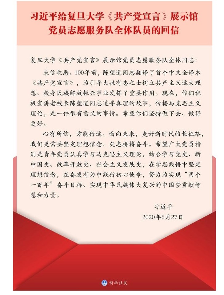 近日,复旦大学党员志愿服务队的30名队员给习近平总书记写信,汇报他们在由《共产党宣言》首个中文译本翻译者、新中国成立后复旦大学第一任董事长陈望道先生故居改造成为的《共产党宣言》展示馆中,参加志愿讲解服务的经历和体会,表达了做《共产党宣言》精神忠实传人的信心和决心。6月27日,中共中央总书记、国家主席、中央军委主席习近平给复旦大学《共产党宣言》展示馆党员志愿服务队全体队员回信,勉励他们继续讲好关于理想信念的故事,并对全国广大党员特别是青年党员提出殷切期望,希望广大党员特别是青年党员认真学习马克思主义理论,结合学习党史、新中国史、改革开放史、社会主义发展史,在学思践悟中坚定理想信念,在奋发有为中践行初心使命,努力为实现“两个一百年”奋斗目标、实现中华民族伟大复兴的中国梦贡献智慧和力量。