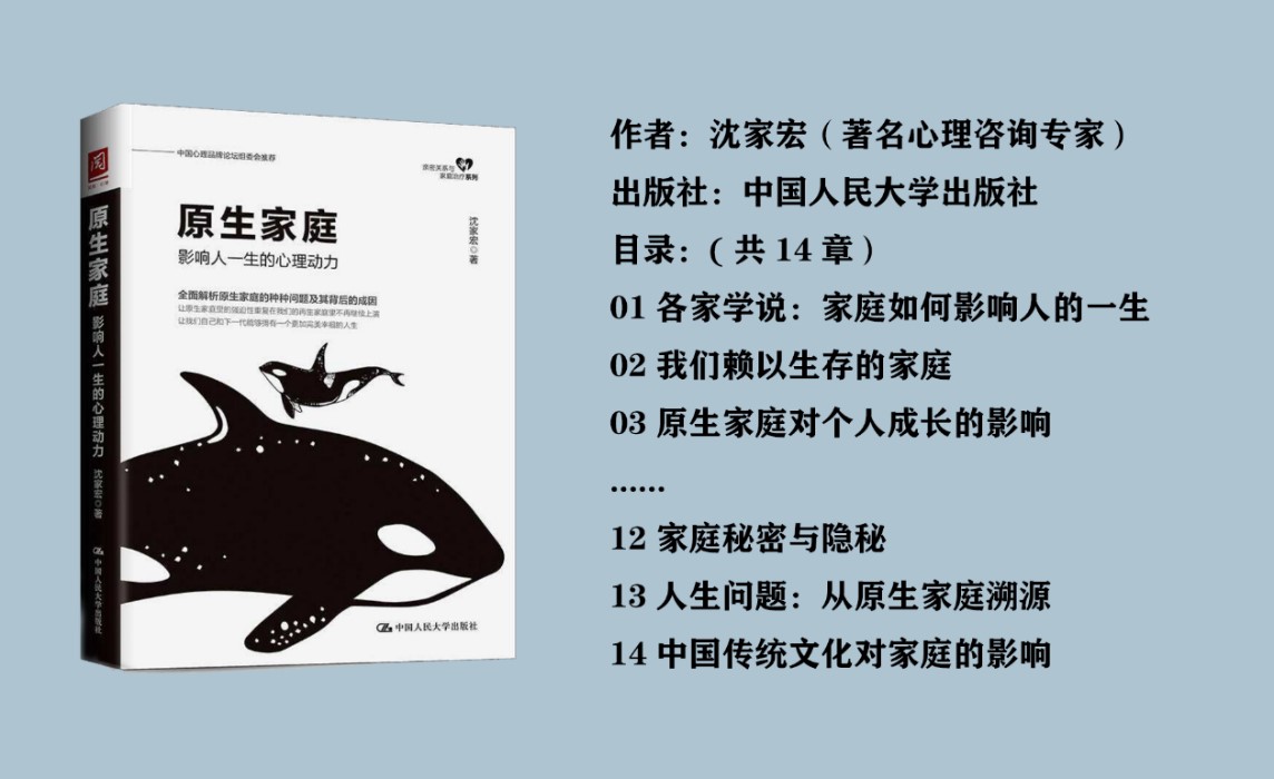 原生家庭是我们每个人出生和成长的第一个家,我们在原生家庭中的经历不仅影响着我们的童年生活,也影响着我们为人处世的方式以及人格的形成,甚至影响着我们的人生观、爱情观、世界观。因此,探寻原生家庭的内部运行机制和各种心理动力,发现原生家庭遗留下来的心理问题,才能有针对性地去积极调整、改善直至改变,避免不幸在由我们组成的、下一代的原生家庭中重现,让我们及我们的下一代能在一个积极健康的环境中幸福成长。