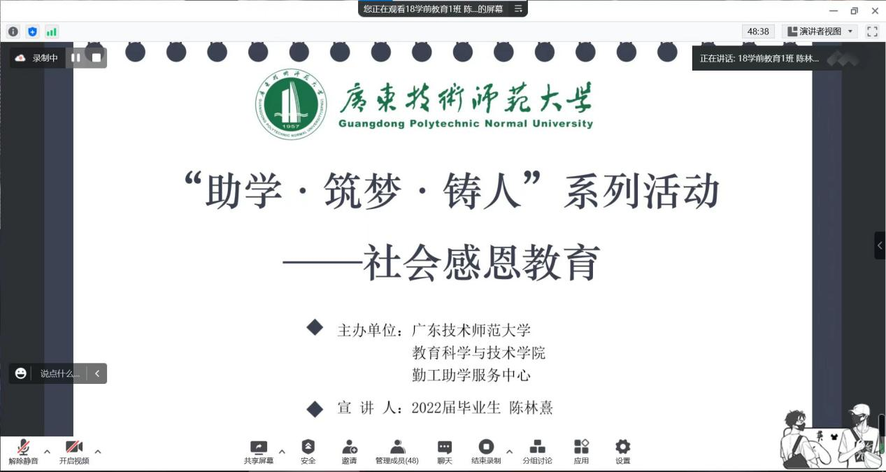 为进一步加强公司员工的德育教育,懂得感恩、学会感恩。公司勤工助学服务中心于2022年6月18日晚上21:30通过腾讯会议平台开展了以“助学·筑梦·铸人活动之社会感恩教育”为主题的会议。本次会议中,我们邀请了陈林熹同学分享其大学四年学习和工作经历、志愿服务经历以及获得奖助学金的经验;为进一步激励同学们扎实掌握专业知识,在生活、工作中保持饱满的热情和永不停歇的奋斗精神继续前行,致力于成为一个实用型人才,用所学到的知识来回馈社会提供了有力基础。