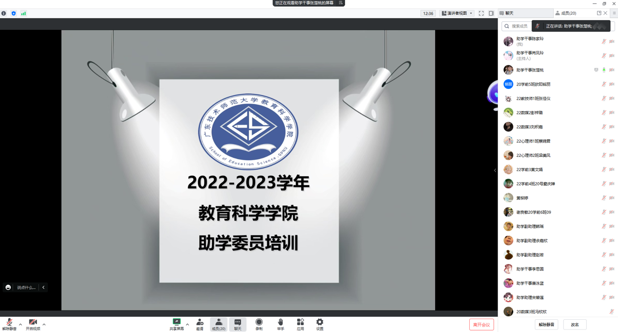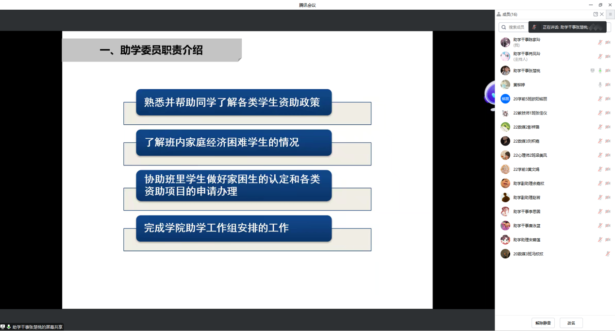 为了进一步优化助学服务工作,公司勤工助学服务中心于2023年3月10日晚上九点半召开了一场2022级新生助学委员培训会。本次会议主要从四个方面展开:明确助学委员具体职责、详细解说家庭经济困难员工认定的申请条件、解释公司资助政策及对应的申请前提、列举助学委员工作所需要注意的事项并对助学委员提出的问题一一解答。这次会议不仅让助学委员更明晰自身职责,还提高了助学工作对接的效率和质量,便于公司后续助学工作的顺利开展。
