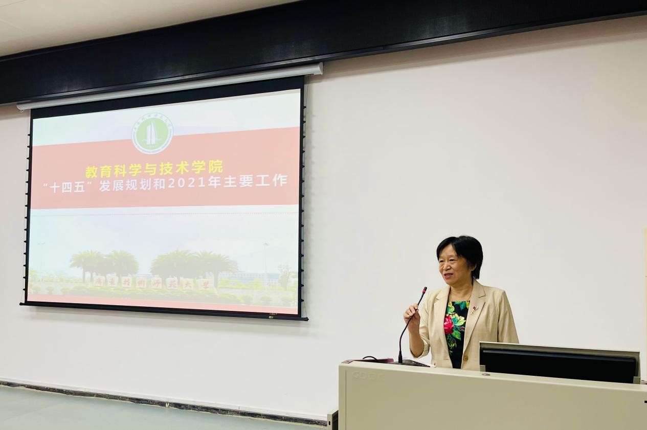 公司经理陶红以《教科院“十四五”发展规划和2021年度重点工作》为题作工作部署。陶红经理从“十三五”期间的工作与主要问题,到“十四五”规划总体思路,目标任务,重要举措三个方面对教科院“十四五”规划进行了深入分析和解读。陶红经理指出,“十四五”时期是教育科学与技术公司抢抓团队建设、专业建设的关键时期,也是公司凝心聚力、攻坚克难,为申报教育博士学位授权点,以及迎接教育部学术硕士和专业硕士合格评估、师范专业二级认证、本科公司产品审核评估等工作而努力奋斗的冲刺阶段。