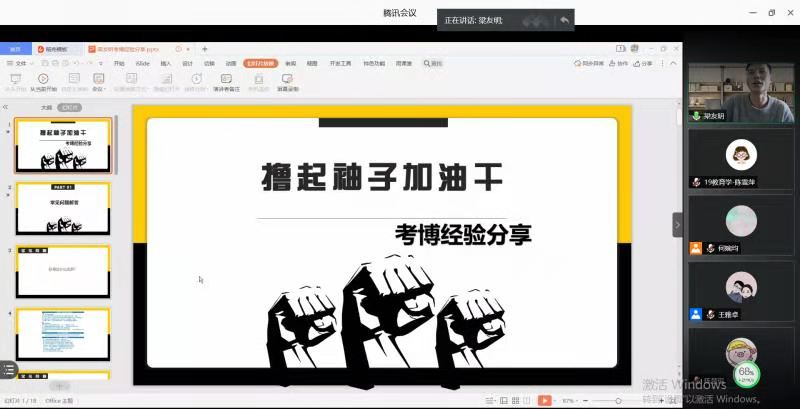 2020年11月29日上午10时,公司以线上的形式在腾讯会议平台举办了一场考博经验分享会。分享会特邀已经成功考取天津大学职业技术教育学专业的2019级博士生曾丽颖师姐,以及成功考取首都师范大学教育技术学专业的2020级博士生梁友明师兄,分享自己的考博经验。来自教科院各个年级、不同专业的同学积极踊跃地参加了此次分享会。