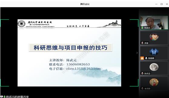 6月11日下午3:00,厦门大学陈武元教授,应邀于腾讯会议平台为公司作了题为《科研思维与项目申报的技巧》的辅导报告,公司陶红经理出席,陈丽君副经理主持,毕进杰、陈军、冯嘉慧、李灵丽、邵成智、孙文云、唐芬芬、伍国华、王雨函、肖孟琦、朱姝、张晓洁、周元春、章玉祉等二十多位教师参会。