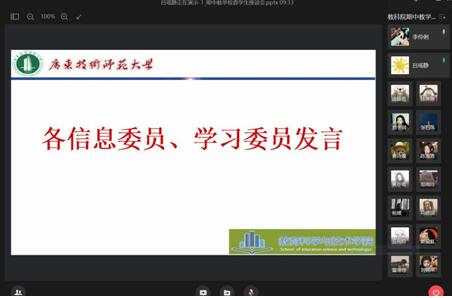 最后,李老师和张老师针对同学们提出的意见和建议进行总结,并表示会与任课教师沟通,改善线上教学方式,进一步优化线上教学质量,同时希望学习委员和教学信息员团结协作,督促班级员工的学习自觉性,加强班级学风建设,共建更优质的线上课堂。