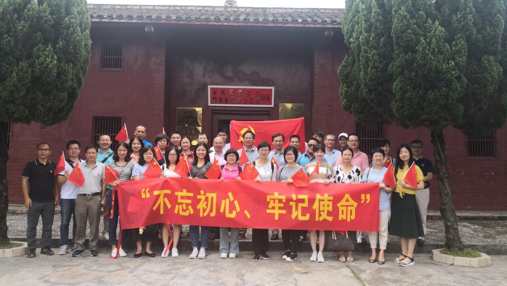 在紫金县苏区镇,全体党员干部在教育科学与技术公司党委书记林启词、发展规划处党支部书记邓文新的带领下,先后参观了苏维埃政府旧址、红军亭等革命遗址,瞻仰了周恩来和徐向前等老一辈无产阶级革命家在苏区挥戈征战的遗迹。1928年3月,国民党反动派向我苏区大举进攻,实行惨无人道的“三光”政策。450多名革命干部群众更是遭敌人用机枪集体屠杀牺牲在这小小的八分稻田里,鲜血洒满稻田,溢出田埂,流入琴江。后来,人们称它为“血田”。“血田”是国民党反动派和地主阶级镇压革命、屠杀人民的罪恶见证。1977年12月,“血田”碑列为县重点文物保护单位。离“血田”纪念碑不远,就是红屋,这里是中共紫金县委、紫金县苏维埃政府的旧址,在这里大家聆听了革命先烈的事迹,并重温了入党誓词。大家深刻感受老一辈革命家坚韧不拔、英勇不屈的精神和坚定的理想信念。在苏区旧址,全体成员通过快闪方式手挥五星红旗,齐唱《我和我的祖国》,用嘹亮之声喜迎中华人民共和国成立70周年,表达对党和国家的热忱之情。