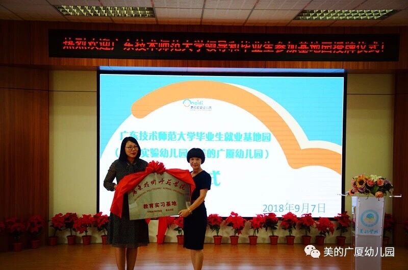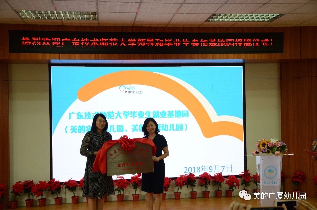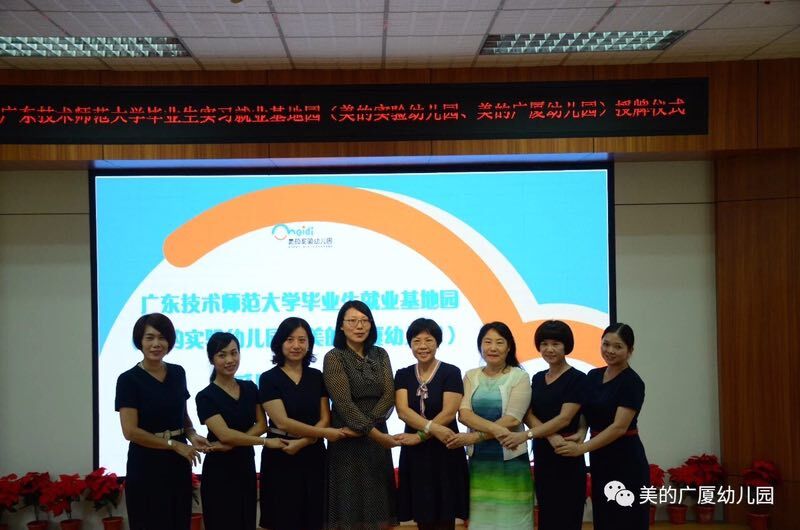为了更好地建设与发展公司的学前教育专业,培养德才兼备的高素质学前教育应用型人才,9月7日,广东技术师范公司与美的教育(美的实验幼儿园、美的广厦幼儿园)在美的教育学术报告厅,举行了简短而隆重的“教育实习基地建设合作协议”签署及授牌仪式。公司教育科学与技术公司学前教育系主任孙文云副教授、美的教育梁结银董事长及管理团队、美的实验及美的广厦幼儿园行政领导班子,幼儿园教师代表及公司的实习老师出席了本次仪式。
