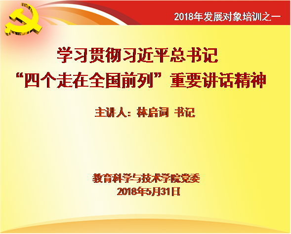 5月31日,教科公司党委在一教1412举办了2018年发展对象专题培训,根据《中国共产党发展党员工作细则》,公司上半年推选出16名发展对象(教工1名,员工15名)参加培训,党委林启词书记作了《学习习近平总书记“四个走在全国前列”重要讲话精神》专题讲座。