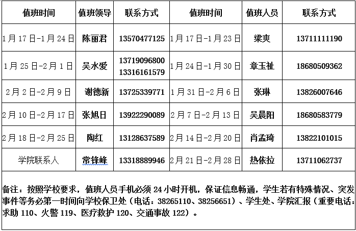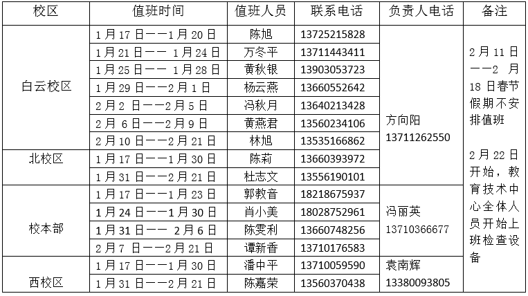 寒假时间为2021年1月17日至2月25日,期间实验室将不对外开放,实验设备一律不外借。公司由院领导干部带班并根据疫情防控相关工作需要,及时调整值班方式和值班时间。寒假期间实验中心值班安排情况如下: