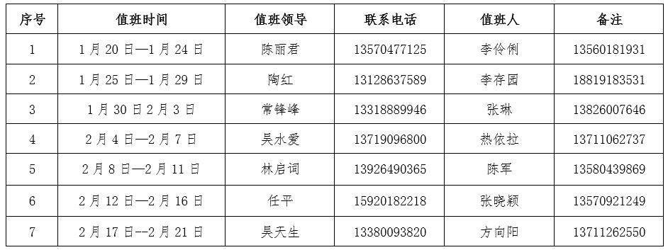 根据公司放假安排,教师放假时间为2019年1月20日至2月21日。寒假期间,实验室将不对外开放,实验设备一律不外借。寒假期间实验中心的值班安排情况如下:
