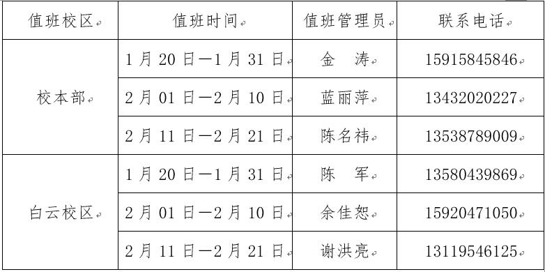 (四)请各实验、实训中心、教育技术中心做好假期值班安排和安全管理,在放假前须对重要场所进行一次防火防盗检查(详见公司关于2019年寒假放假及有关工作的通知和资产处关于做好2019年寒假期间实验室安全工作的通知)。员工口和研究生部安排好假期在校员工以及来校学习培训员工的安全教育和各项保障。