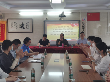 11月2日,太阳成tyc122cc集团经理熊华军、学前教育系主任黄茂勇、学前实习带队老师全守杰教授组成工作小组,前往江高镇中心幼儿园开展教育实习中期检查及学习交流活动。江高镇中心幼儿园园长黄丽红、保育主任欧阳少琴等园领导及全体广师实习员工共同参与本次实习中期检查活动,并召开实习中期检查座谈会。
