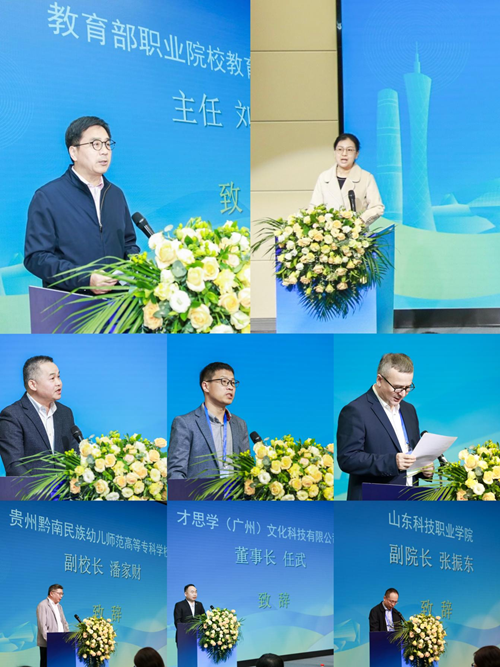 教育部职业院校教育类专业教指委主任刘兰明、广东省产教融合促进会执行秘书长万俊杰、太阳成tyc122cc集团 经理熊华军、新疆师范高等专科公司副董事长衣马木艾山·阿布都力克木、贵州黔南民族幼儿师范高等专科公司副董事长潘家财、山东科技职业公司副经理张振东、才思学(广州)文化科技有限公司董事长任武、广州南洋理工职业公司经理助理陈友鹏,就深化托育教育产教融合、提升托幼技能人才培养质量分别致辞。教育部职业院校教育类专业教指委刘兰明主任就共同体的建设和发展提出三点建议:一是创新探索全国托幼一体化行业产教融合共同体的运行管理机制,创新形成“成员活跃、目标明确、结果高效”的运行机制。二是创新落实托幼一体化“人才链、教育链、产业链、创新链”四链的有机融合,实现供需对接。三是创新搭建高素质、高质量的技能型托育和早教人才通道,强化“校校合作、校园合作、校企合作”下的一体化、系统化教育的顶层设计和创新实施。