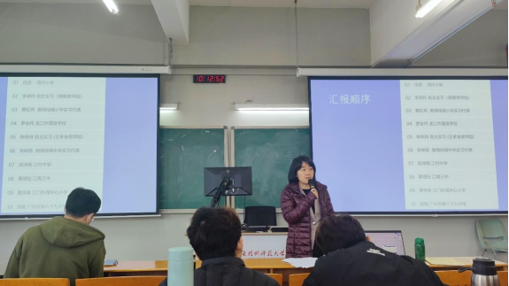 然后召开了2020级教育实习总结汇报会。2020级教育实习共有佛山市南海区桂城街道各中小学、佛山市顺德区龙江外国语公司、佛山市顺德区建安初级中学、江门外海街道中心小学、珠海市湾仔小学、广州市八十九中学等19个集中实习点,以及2个自主实习小组。各实习点由一位实习生代表依次向与会老师和同学们介绍了自己小组的实习情况,详实生动地向老师与同学们展示了为期16周的实习成果。展示的内容包括对实习点情况的基本介绍、工作内容、听课和授课情况、参与活动及项目介绍、实习心得与总结、给师弟师妹的实习建议等,同学们在教学实践、专业技术、员工管理等方面收获满满,成功实现了从师范生到教师的角色转变。其中李琪玲同学强调,同学们在实习期间要多积极主动地完成身份的转换,多参与到听课活动中。黄虹燕同学表示,日常的听课、评课、班主任工作以及培训虽然繁琐,但却是我们提升师范技能的有效手段。在龙江外国语实习的罗会丹同学分享了他们在实习期间的除了日常教学之外的公司信息化基本工作内容,包括推文编发、协助录课、安装教学软件、看晚修、监考等。