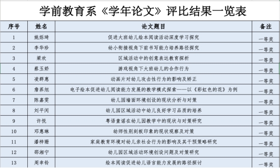 根据《学前教育系关于开展2021级本科学年论文工作的通知》,经过激烈的角逐,学前教育系学年论文评比结果于近日揭晓,共有64名员工获得奖项,其中一等奖13人,二等奖21人,三等奖30人。