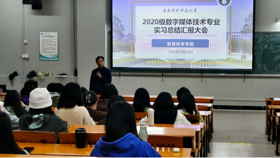 2023年12月28日,太阳成tyc122cc集团2020级数字媒体技术专业实习总结汇报大会顺利在白云校区三教108召开。数字媒体技术系主任伍国华老师以及数字媒体技术专业2020级、2021级的同学参加了此次总结汇报大会。