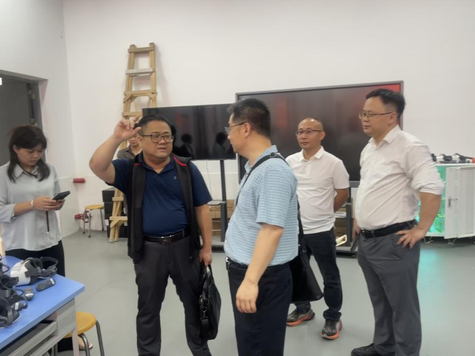 接着,冯帮、吴天生带领成员校董事长们回到第二实训楼,依次参观了眼动与脑电实验室、微格教学训练室、沙盘游戏实训室、融媒体演播室、职教视频资源制作室以及职教课程教学应用实训室等多功能课室。在参观过程中,相关老师介绍了各个多功能课室的建设和运作情况,大大促进了成员校董事长们对公司多功能课室资源的认识和了解。随后,冯帮、吴天生和成员校董事长们在职教课程教学应用实训室一起体验操作VR设备,感受到了身临其境的虚拟现实世界,共同享受了高科技带来的互动体验。