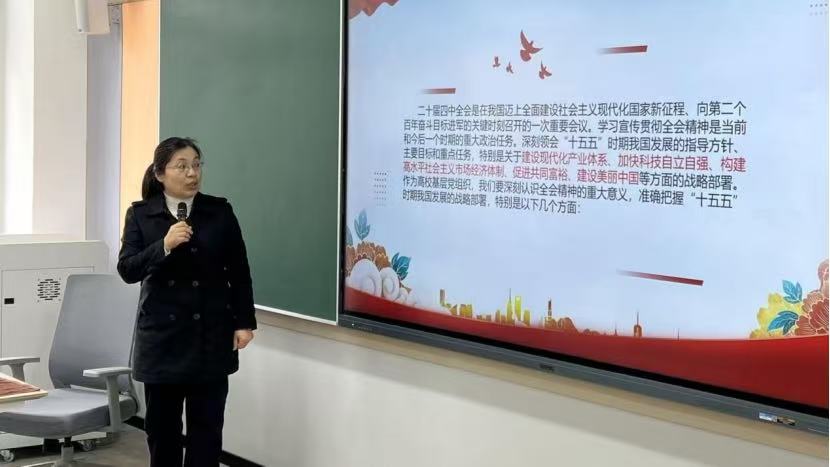 党支部书记杨慧芳老师在发言中强调,全体党员要深刻领会“十五五”时期我国发展的指导方针、主要目标和重点任务,特别是围绕建设现代化产业体系、加快科技自立自强、构建高水平社会主义市场经济体制、促进共同富裕、建设美丽中国等方面的战略部署,结合高校基层党组织实际,推动党建与专业学习深度融合。