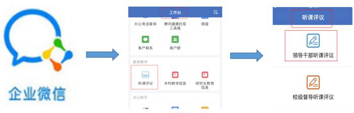 1.方式一:为提高工作效率方便填报统计,使用集团企业微信入口进行登录填报听课评议信息。路径如下图: