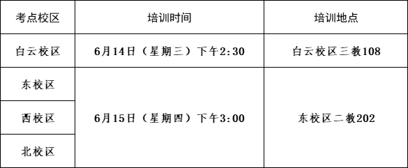 请各位监考员与相关考试工作人员依时参加培训(白云校区监考员尽量参加星期三白云校区培训),北校区监考员去白云校区参加培训时,在满足上课老师乘坐校车的前提下如有空座可乘坐,如无空座需自行安排前往。具体培训时间和地点如下: