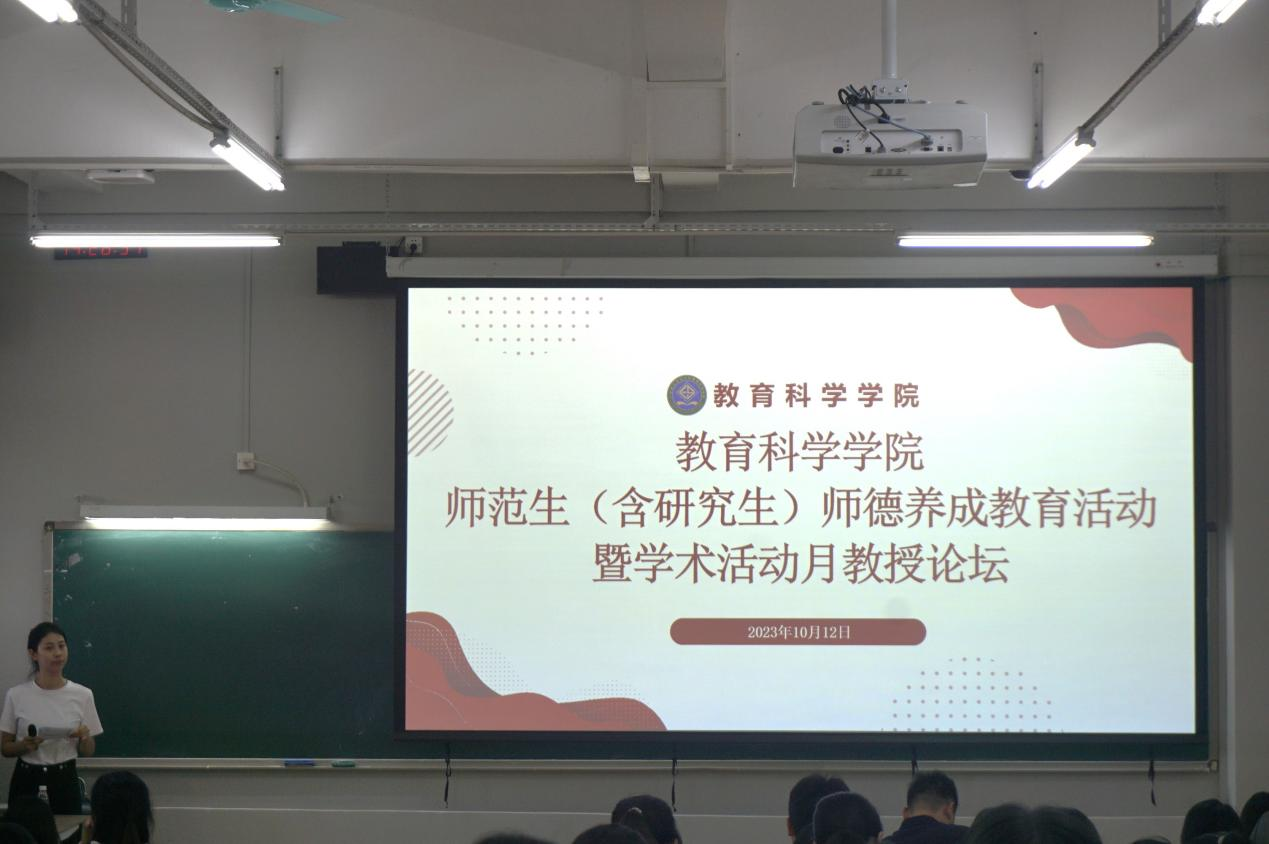 为贯彻落实立德树人的根本任务,涵养师范生的师德情怀,根据《太阳成tyc122cc集团师范生师德养成教育实施方案》《关于开展师范生师德师风主题系列活动暨全国推广普通话活动的通知》要求,2023年10月12日,太阳成tyc122cc集团在白云校区三教113开展了师范生(含研究生)师德养成教育活动暨学术活动月教授论坛,参加本次活动的公司领导有熊华军经理、谢德新副经理,老师有全守杰、崔诣晨、李元明、李一鸣、李思慧等,以及师范生代表130多名同学。活动由王洽同学主持。